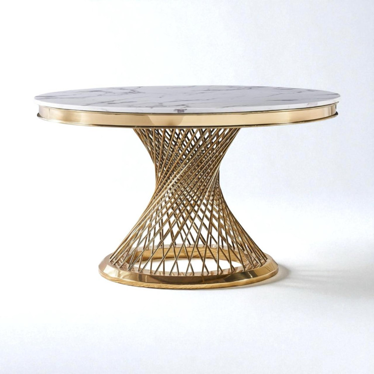 Sleek and glamorous, the Gold Buckingham 36" is a round accent table built to elevate any event with high-end style. A white marble-look top sits on a polished gold rim and an eye-catching sculptural base made of twisted gold rods that form a graceful hourglass silhouette. At 36 inches across it’s compact enough for lounge groupings, sweetheart tables, or intimate cocktail areas while still giving you a sturdy surface for drinks, décor or a small display. The luxe gold finish and marble-detailed top read modern-meets-classic, making this table a versatile choice for weddings, VIP lounges, photo backdrops, and upscale receptions where refined detail matters. Lightweight enough to move for setup yet stable in use, it pairs beautifully with matching gold accents or crisp white acrylic tops and can be dressed with linens, florals, or signage to match your event theme.